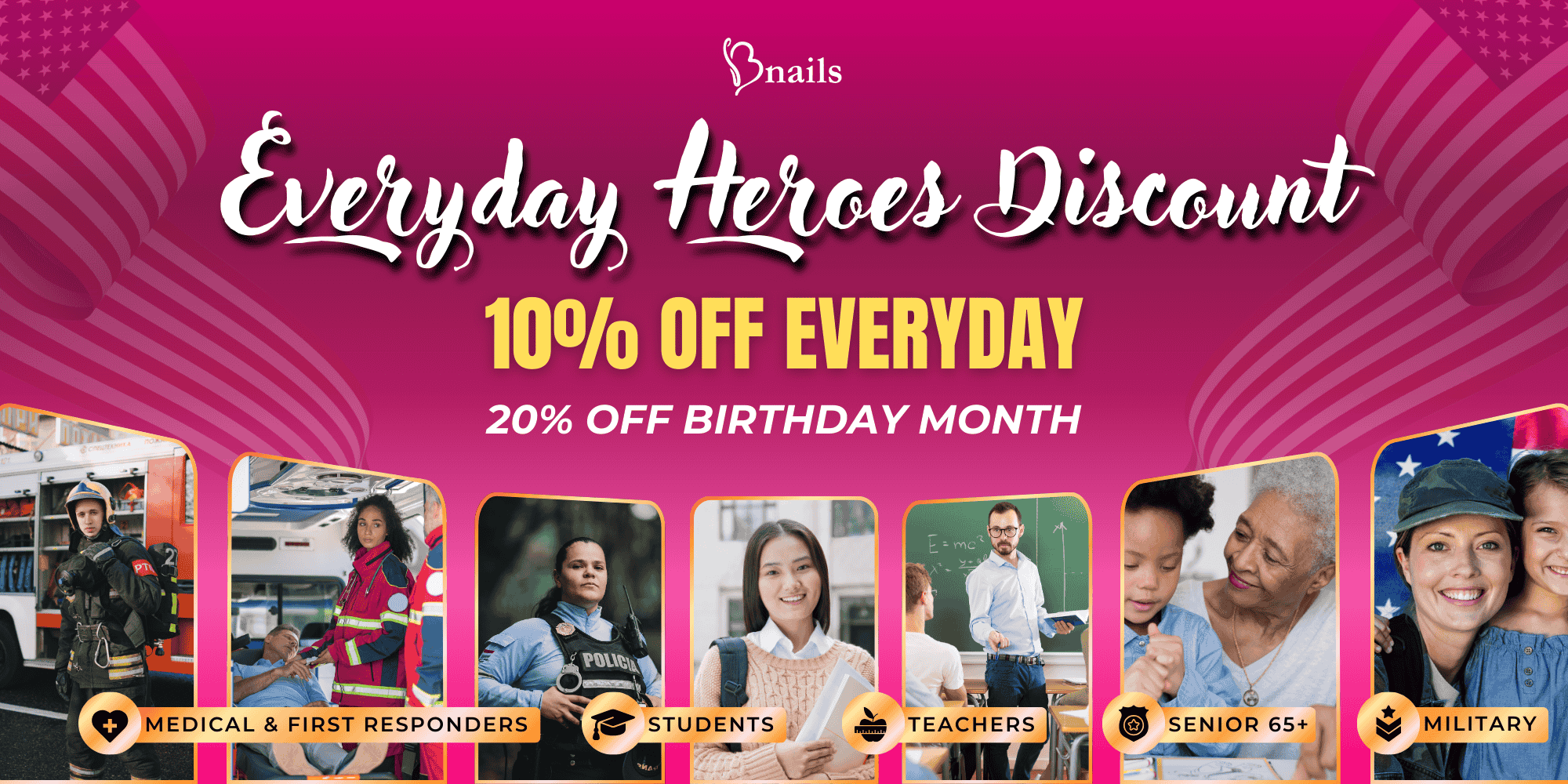 Bnails Everyday Discount Show your valid ID and save at Bnails! We're proud to offer everyday discounts to show our appreciation for those who serve our community.